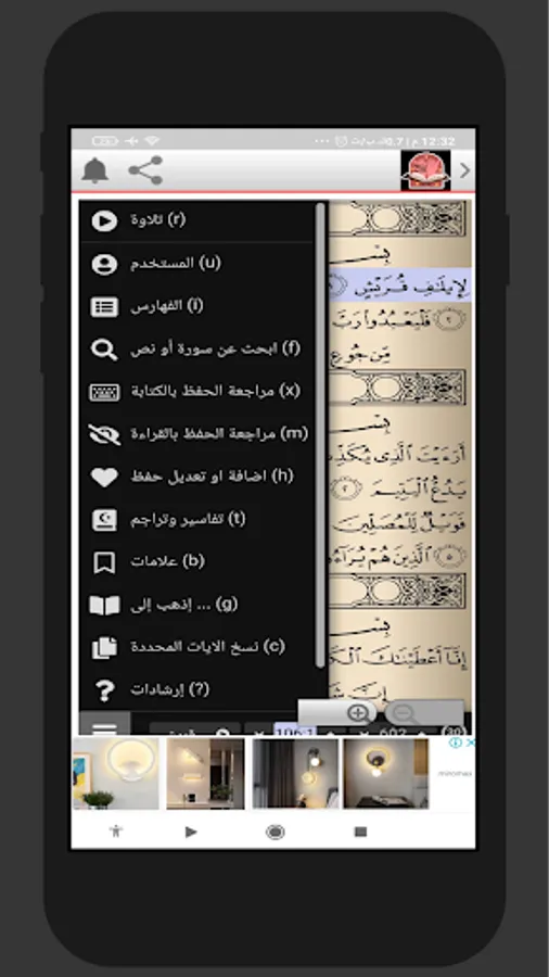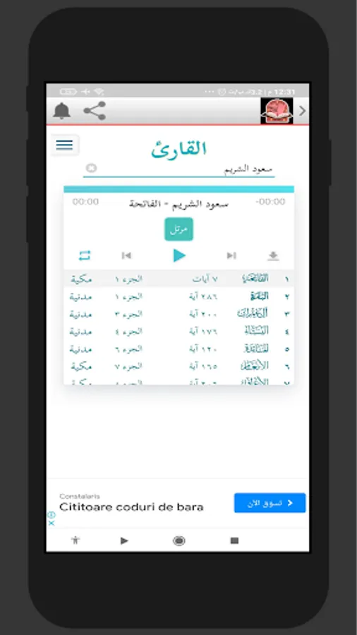 · خيارات الصوت المتقدمة للمساعدة في الحفظ: تكرار الآية، والسورة، والفاصل، وعدد من حالات التكرار، والتحكم في سرعة التلاوة.