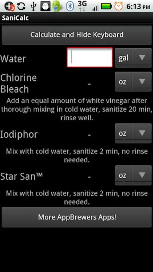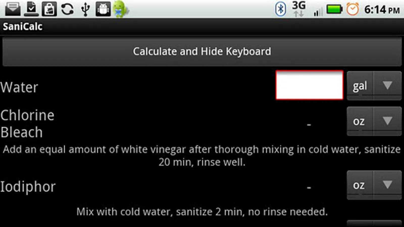 SaniCalc calculates the amount of Chlorine Bleach, Iodophor or Star San to make a sanitizing solution for a given volume of water. It will calculate in gallons and ounces or Liters and Milliliters, or any combination thereof. Originally designed for Home Brewers but it will work for anyone.
