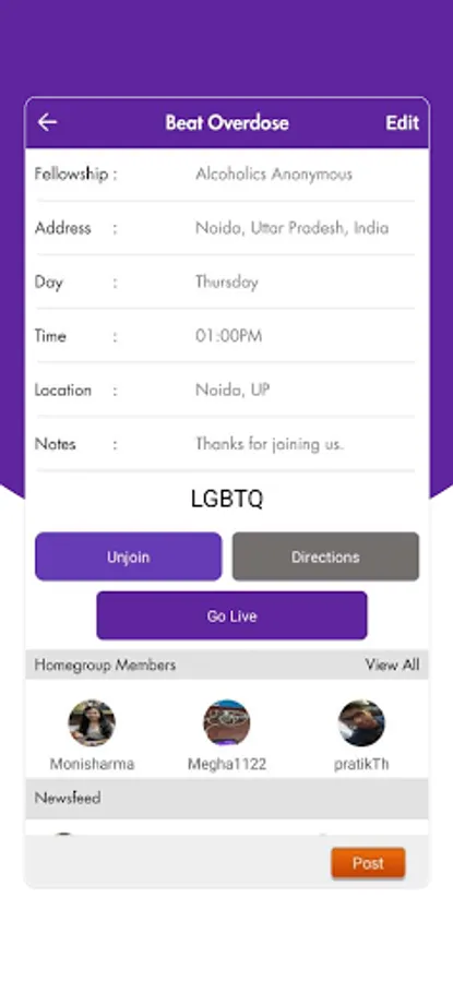 - Meetings – Add your homegroup, join your home group, get directions to meetings, stream your homegroup live, chat with your homegroup members, star an In APP meeting