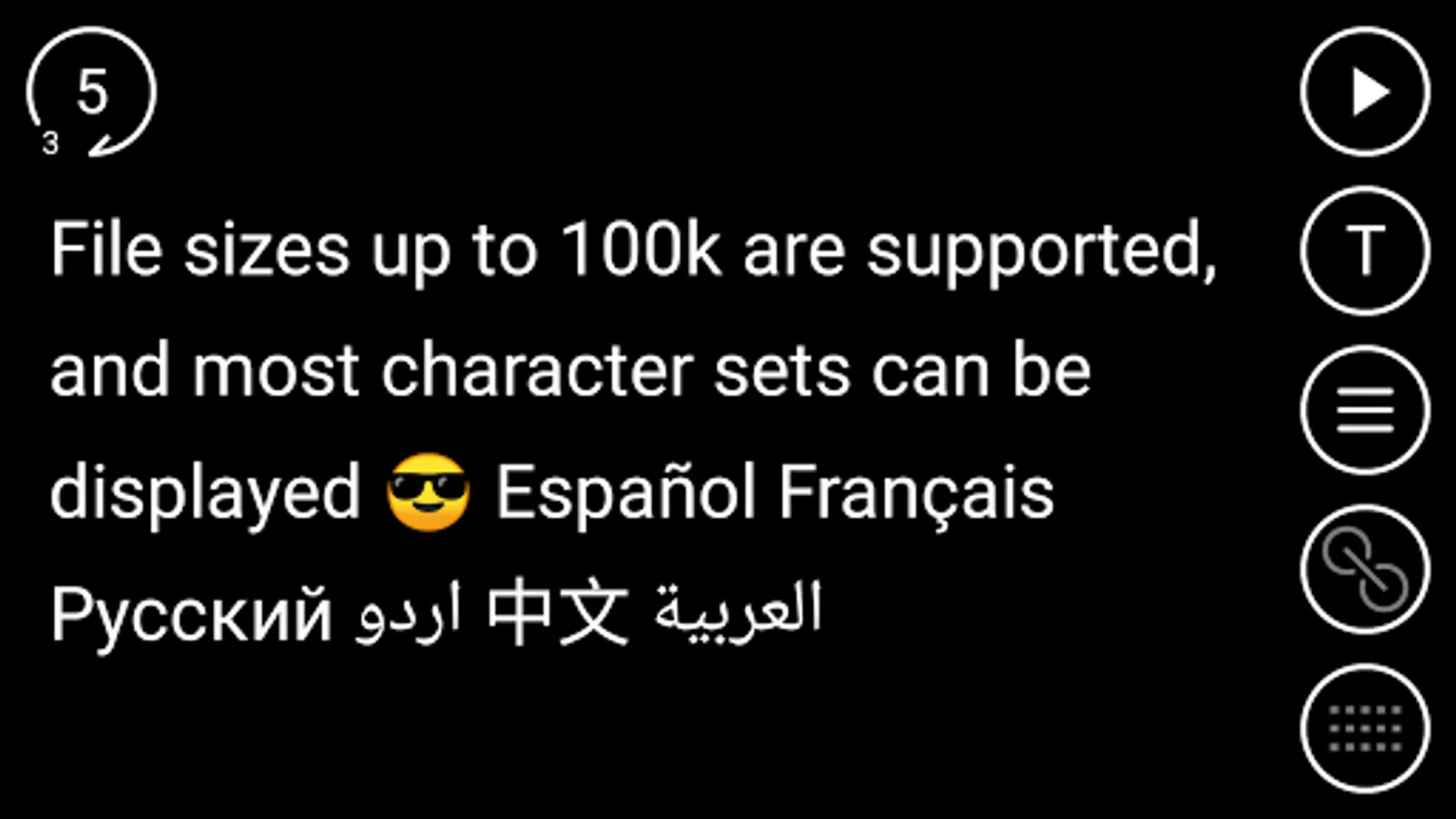 Keyboard keys can be re-assigned, TEXT files up to 100k are supported, and most languages and character sets can be displayed. Mirroring, margins, spacing, text size and scroll speed can all be configured.