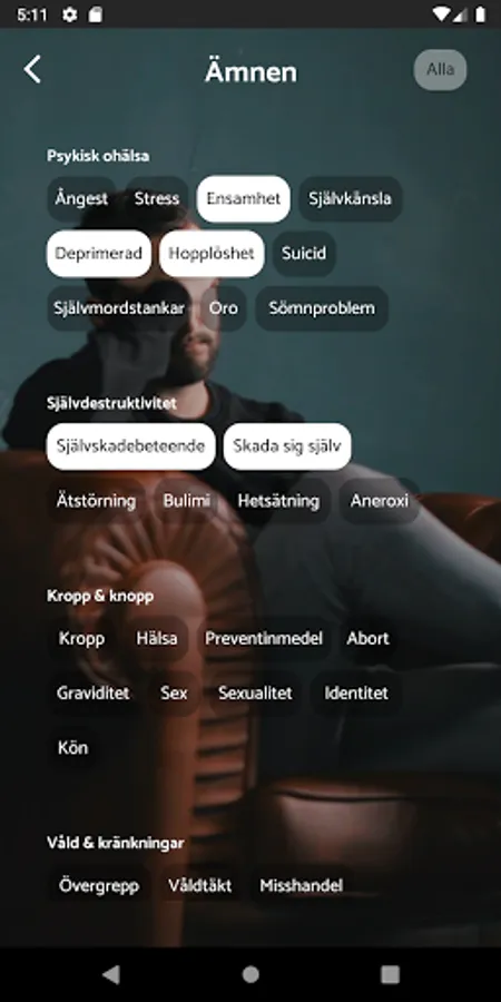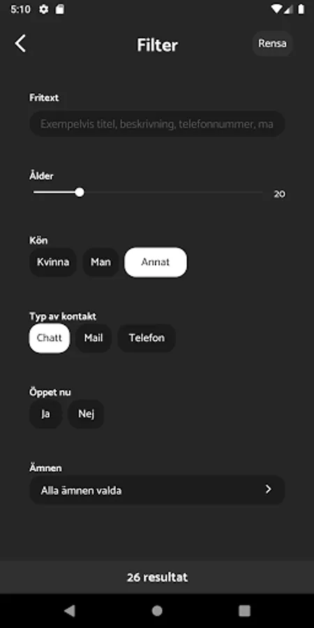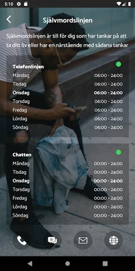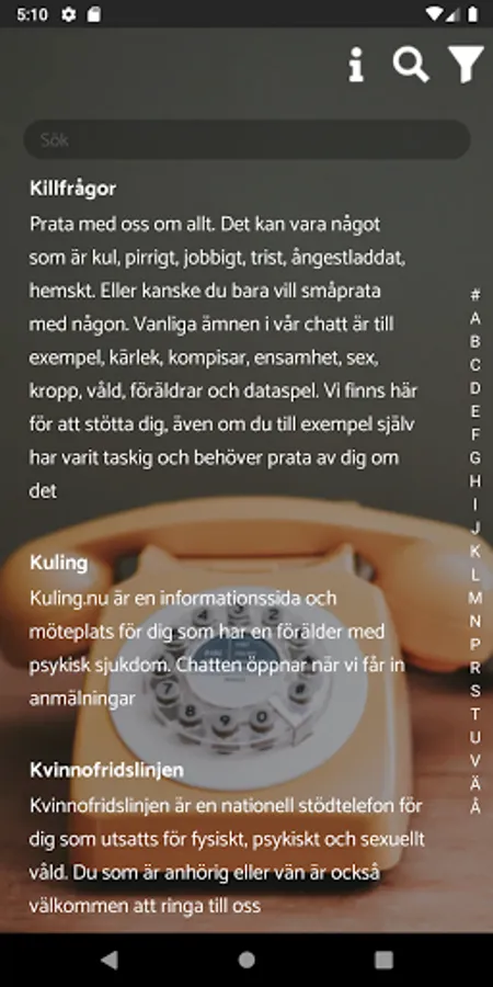 The app lists helplines to have a place for different support regardless of whether you suffer from mental illness or if you are related to someone who suffers from mental illness. You can use the filter to filter by age, gender, type of contact, whether the helpline is currently open and various topics that are relevant to you.