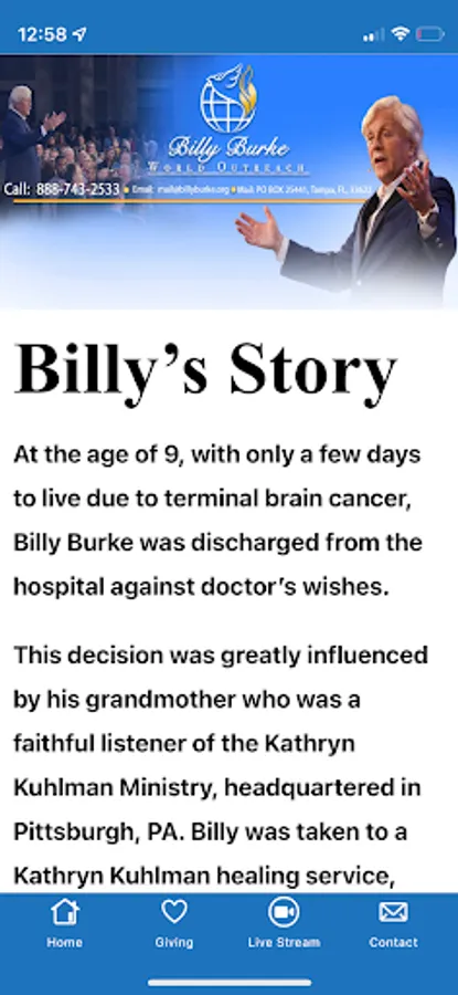 Billy Burke is a Christian evangelist with over 40+ years invested in the ministry. He was healed of terminal brain cancer under the Kathryn Kulhman ministry. Today, he travels the world spreading the message of supernatural faith, expectancy and that Jesus still performs miracles.