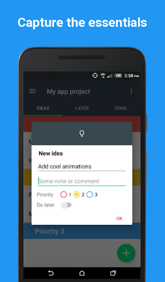 Ideas Tracker has an entirely material designed interface and follows Google's design guidelines for a modern and simply beautiful experience.