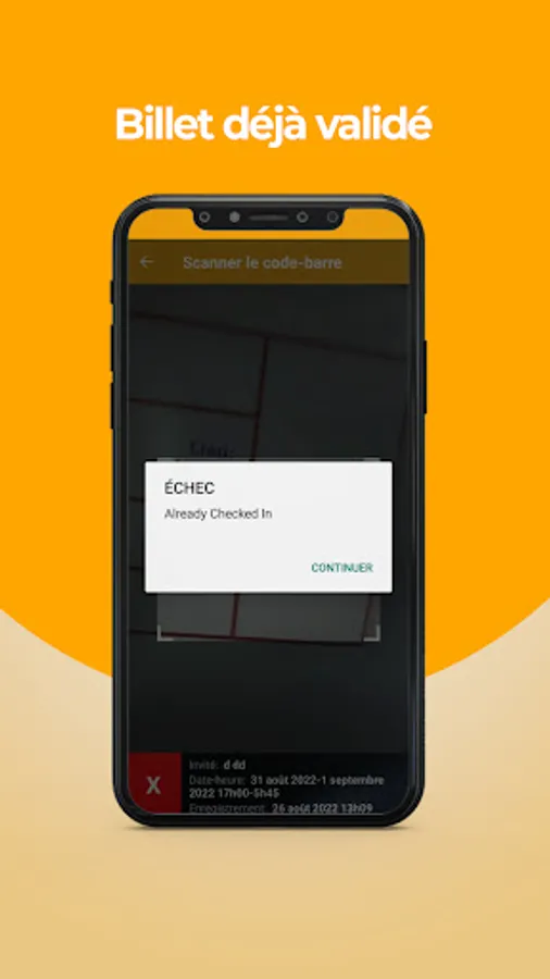Scan the 1D barcode or QR code on the guest ticket directly from your device using the built-in camera or a portable Bluetooth barcode scanner.