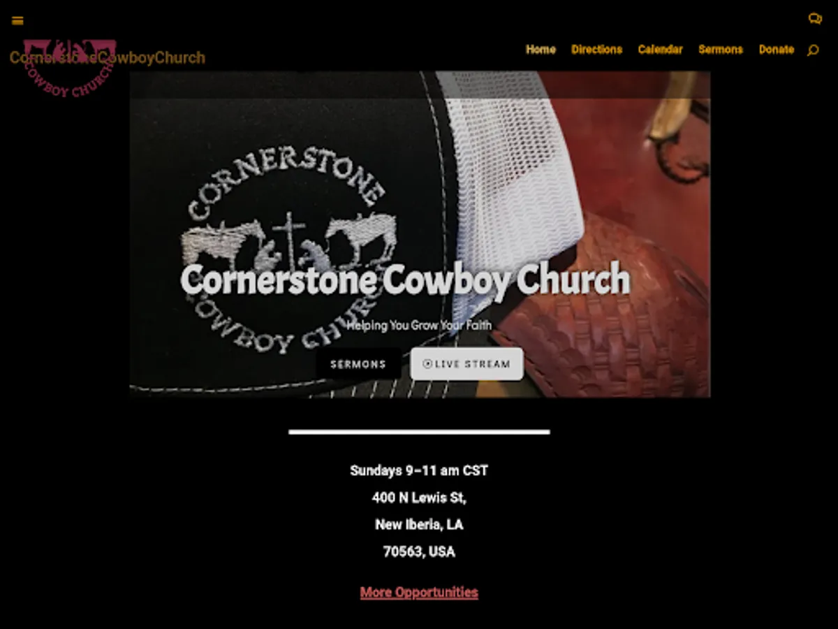 Cornerstone Cowboy Church has a long, proud history of serving the community of New Iberia. Through the dedication of our leadership, pastors, and volunteers, we are committed to the teachings of Jesus Christ and are here to spread His message. We are open to worshippers of all ages and backgrounds, and strive to lead all who worship with us toward a deeper love for God. Cornerstone Cowboy Church - 400 N Lewis St, New Iberia, LA