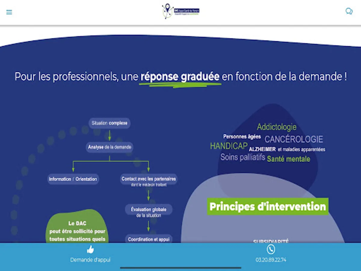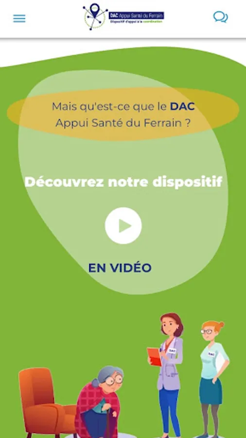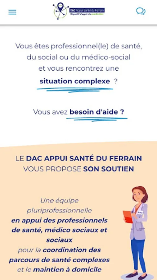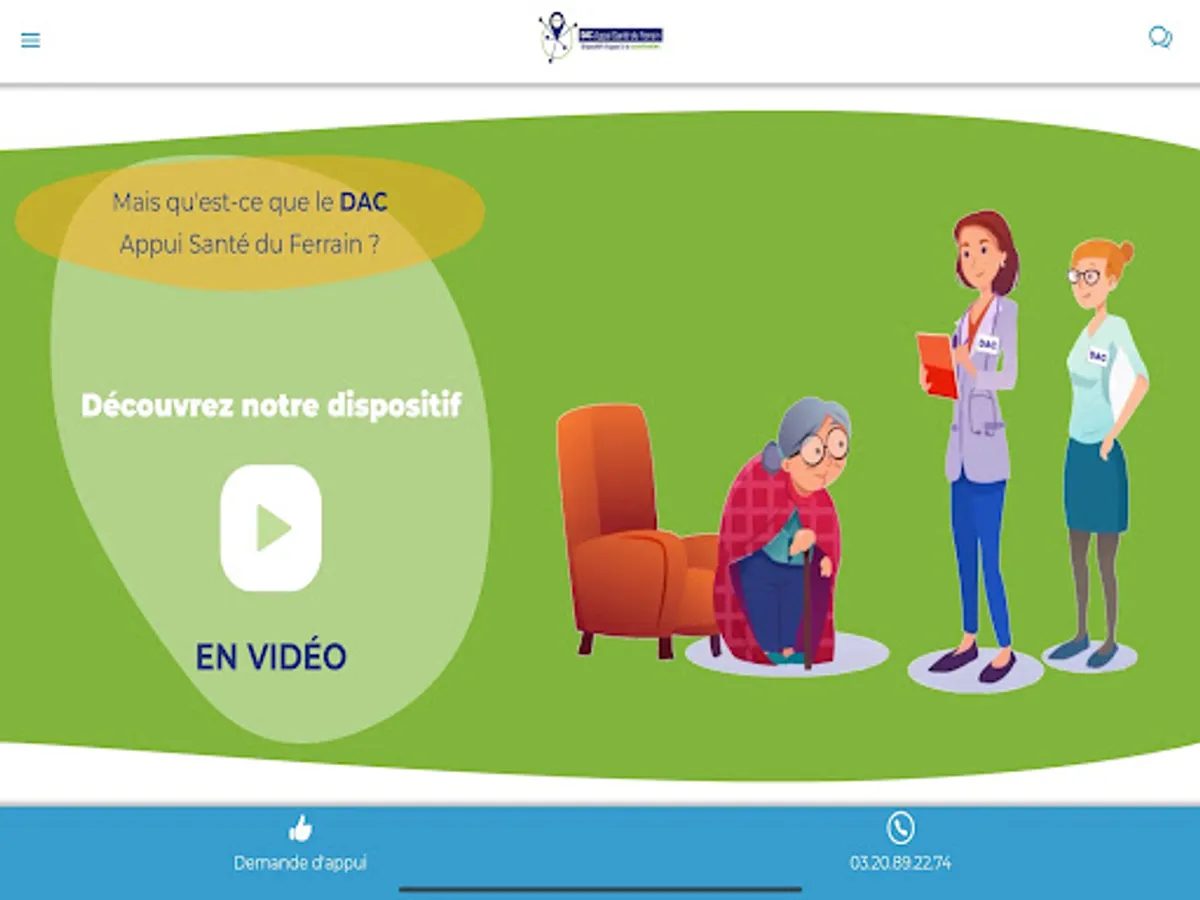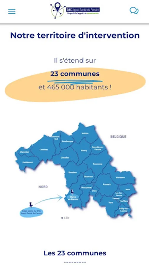 This application allows you to be informed in real time of the actions carried out by the DAC Support Health of Ferrain, radiating over the 23 municipalities of the Pays du Ferrain, located in the Nord department.
