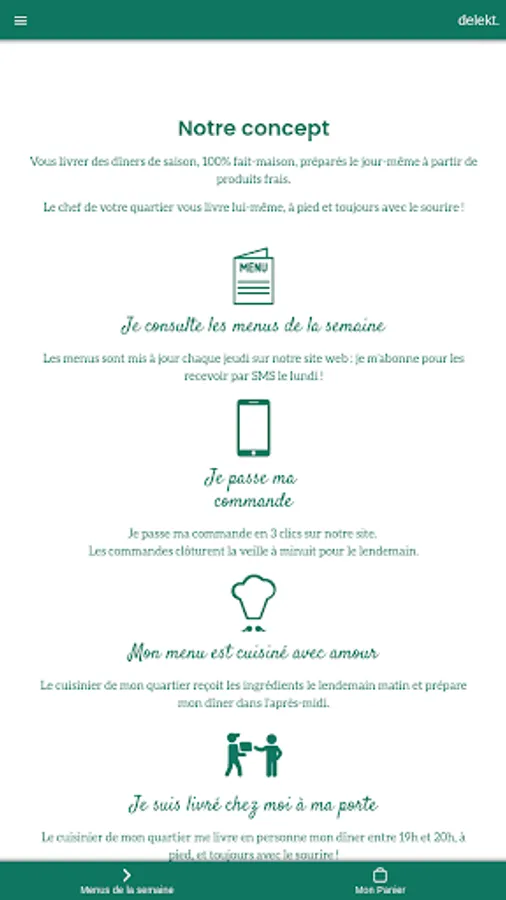 With the delekt. App, you can order in 3 clicks a 100% homemade dish cooked the same day by a passionate amateur chef. He delivers you on foot and with a smile!