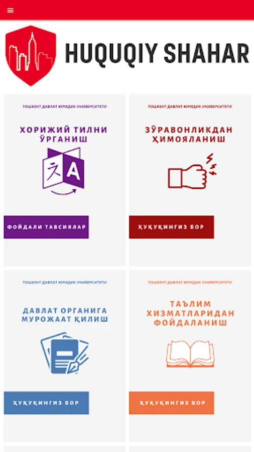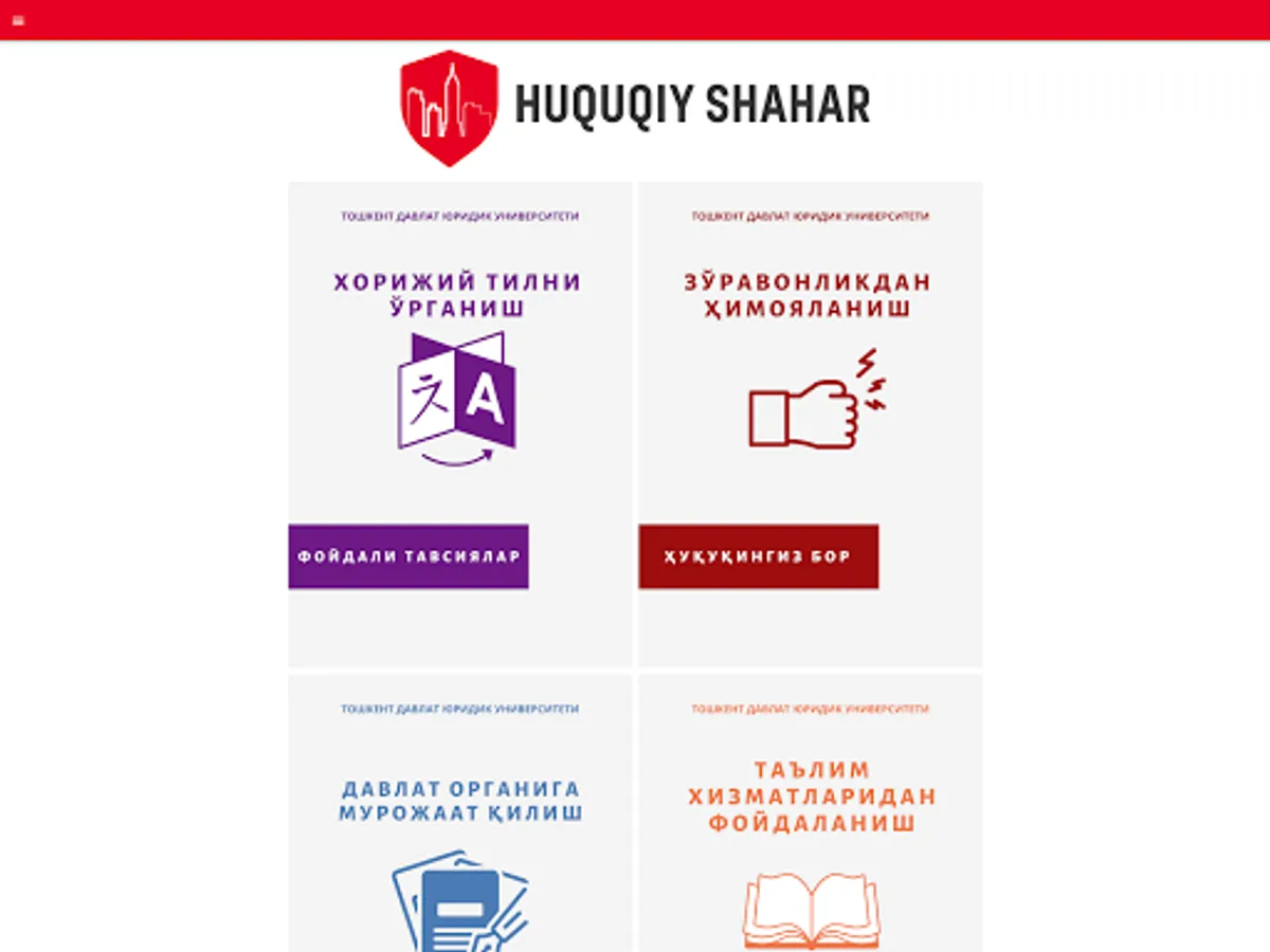 "Қuқuқy shakar" mobile ilovasi orgali yuқori malakali mualliflar, shu jumladan Toshkent davlat university lawyer and professor-ўқituvchilari tomonidan yaratilgan ҳamda aҳoliu, tadbirkorlar va mutahassislarni iziborla tadbirkorlar va mutahassislarni қiziқboriotra iziқbori Malumotlar tushunarli, sodda va қalқchil tilda yozilgan bўlib, fuқarolarimizda ҳuқuқy bilimlarni oshirishga amda kundalik savollarga javob berishga қaratilgan.