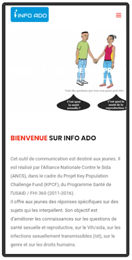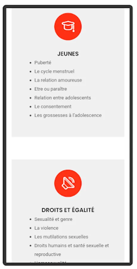 It offers young people specific answers on subjects that concern them. Its objective is to improve knowledge on issues of sexual and reproductive health, HIV / AIDS, sexually transmitted infections (STIs), gender and human rights.