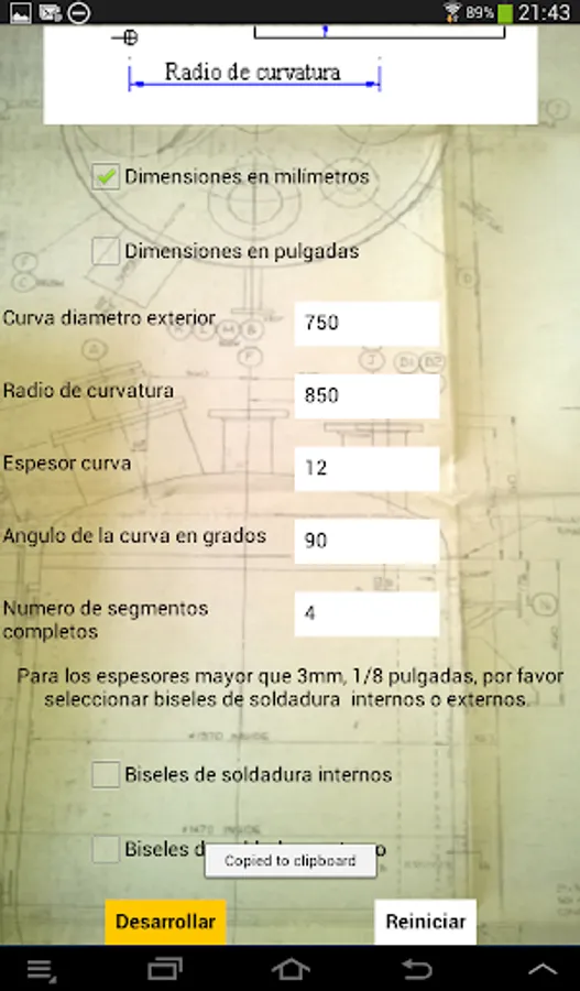 La calculadora funciona hacia fuera la longitud correcta desarrollado para el ingresado fuera de diámetro y la echada entre las líneas de desarrollo