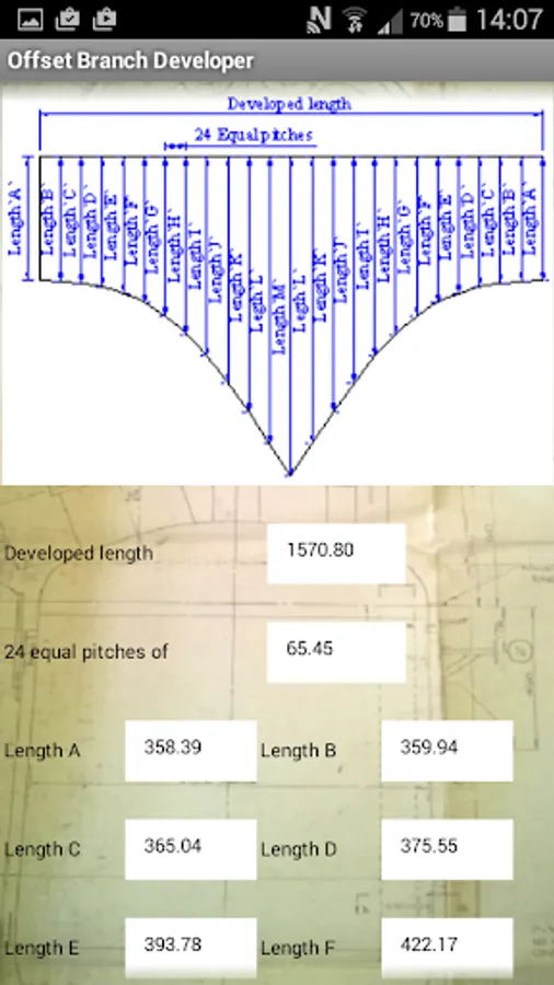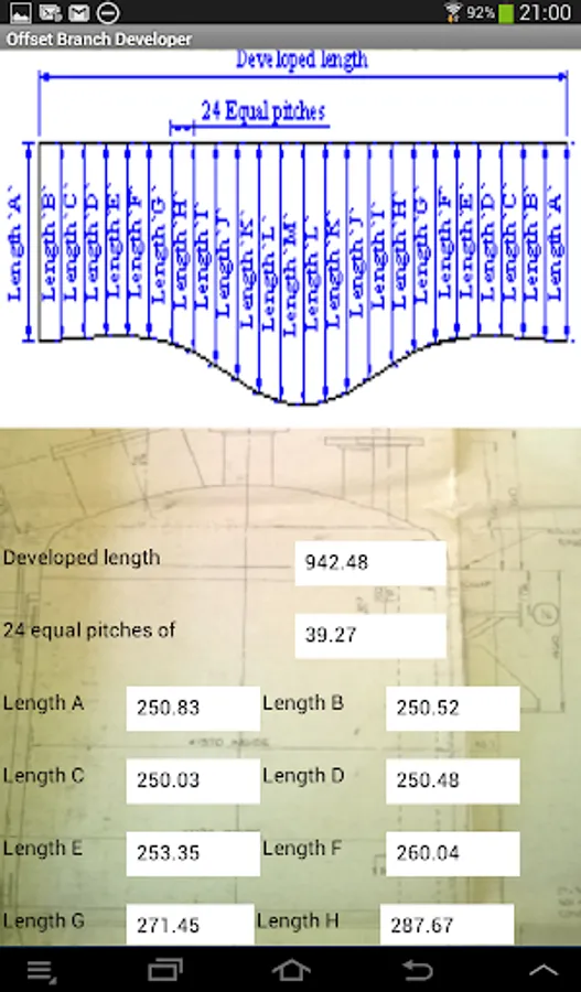 The developed length of the branch circumference and pitch of the developing lines are displayed at the top of the results page with the true developed lengths shown below enabling you to mark out the pattern quickly and easily.