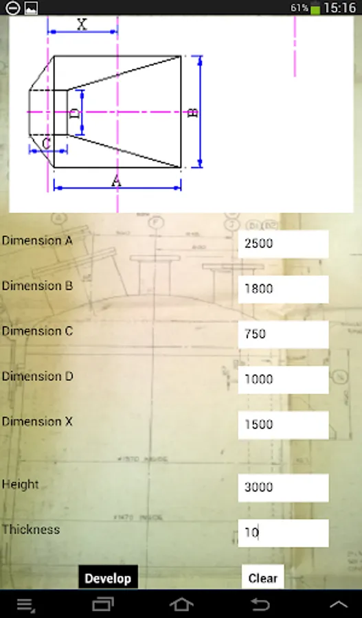 On the next screen enter the required dimensions, then press/touch the develop button.