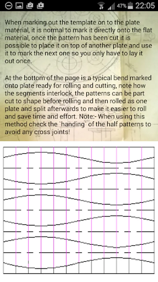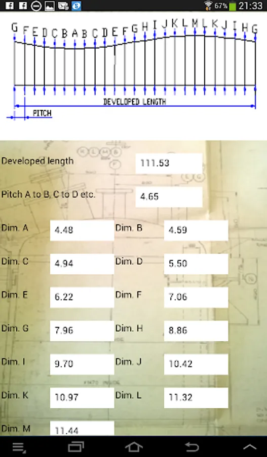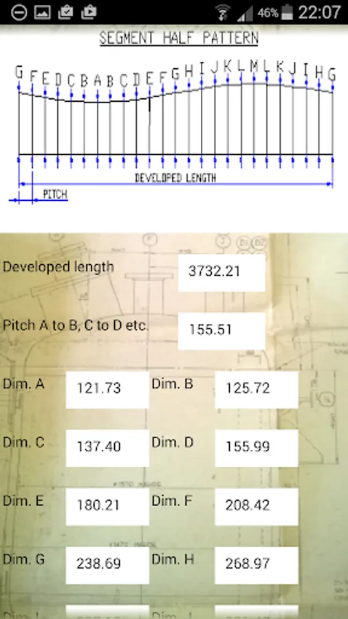 Press/touch Develop button/icon, developed length, pitch dimension and developed lengths for A, B, C, D, E etc. will be displayed. A drawing will also be displayed, this drawing is for reference only, showing what the developed half pattern will look like and the positions of the developing lines.