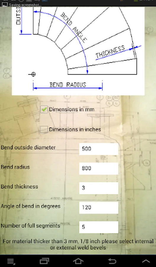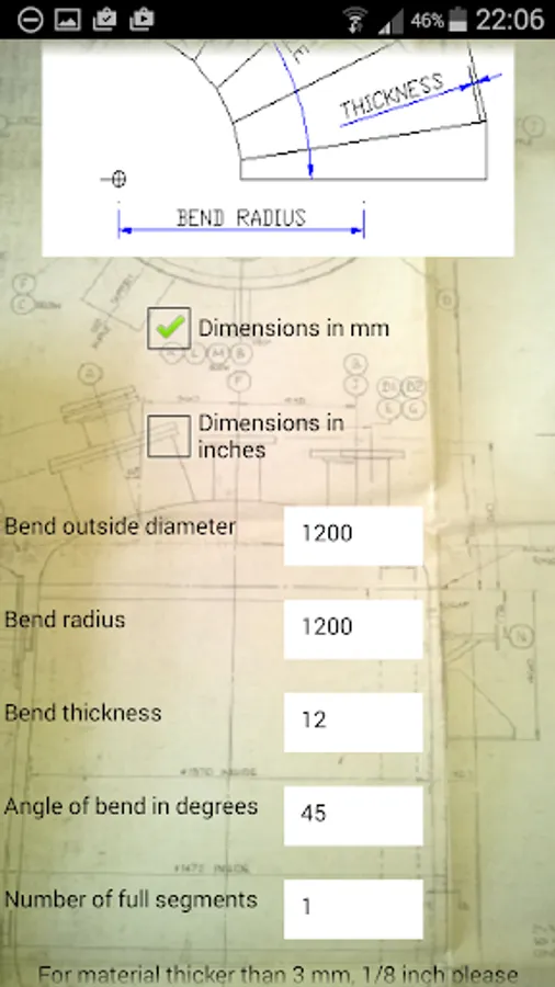 To Use:- Select ins or mms, enter pipe outside diameter, bend radius, number of full segments, material thickness and bend angle (90 degree is default, but any angle can be entered ) .