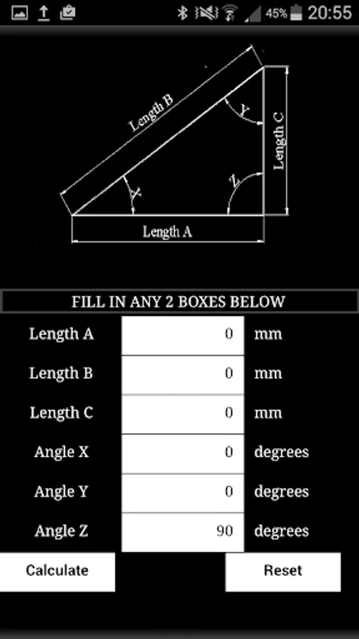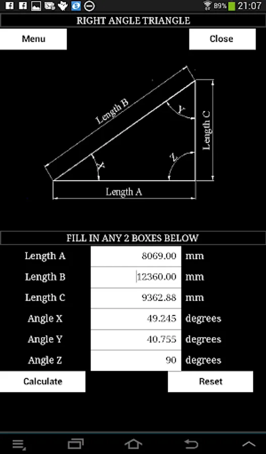 Right-angle calculations are available for inputs:- AB, AC, AX, BC, BX and CX.