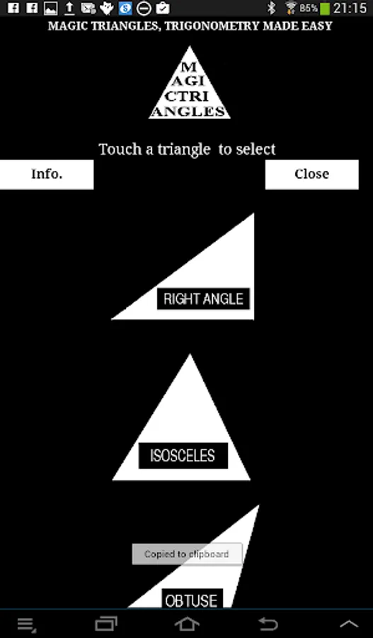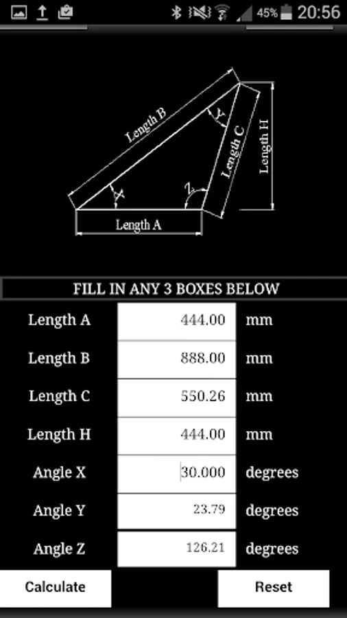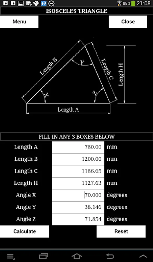 Some input dimensions work for both ISOSCELES and OBTUSE triangles, for instance, inputs B 244.9mm, C 200mm and angle Y 75 degrees work with both. However the results obtained are for the ISOSCELES triangle. so please try to select the correct triangle from the start screen.