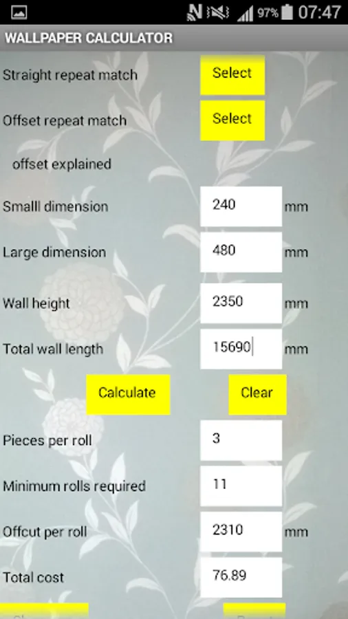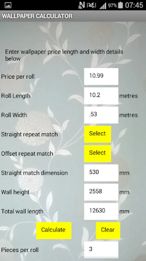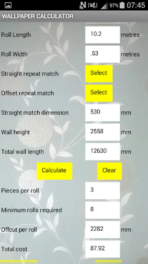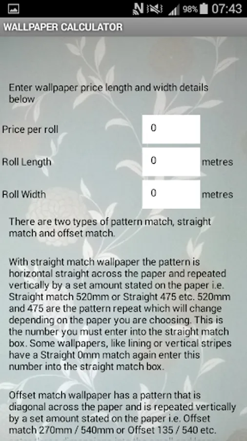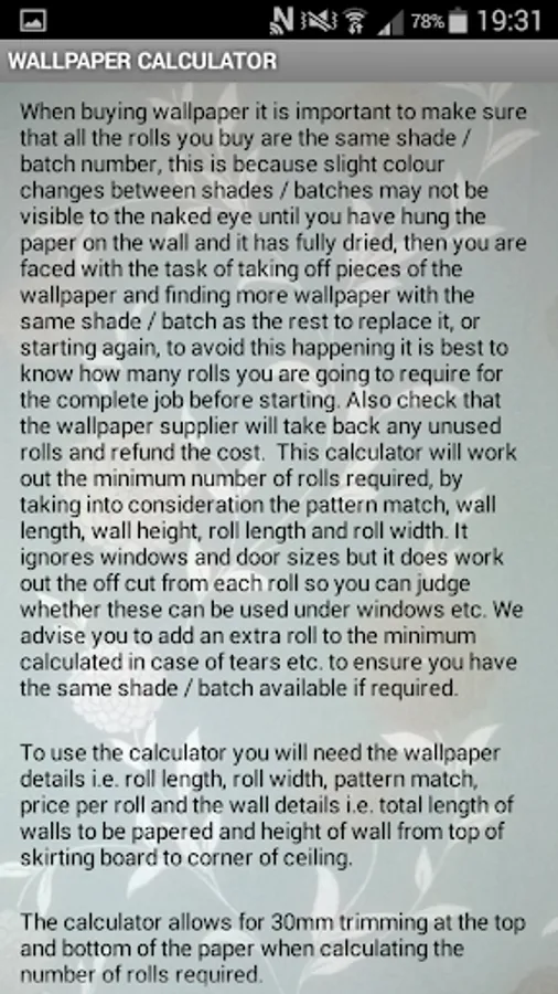 To use the calculator you will need the wallpaper details i.e. roll length, roll width, pattern match, price per roll and the wall details i.e. total length of walls to be papered and height of wall from top of skirting board to corner of ceiling.