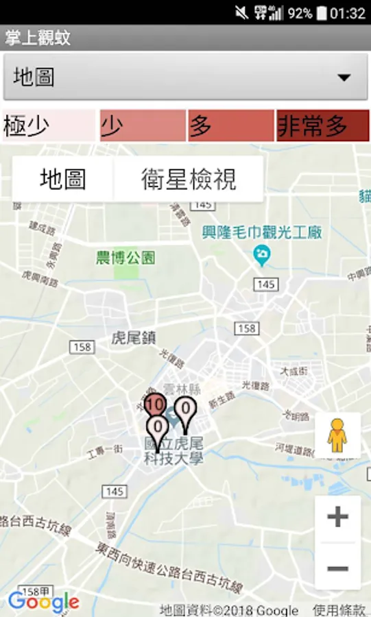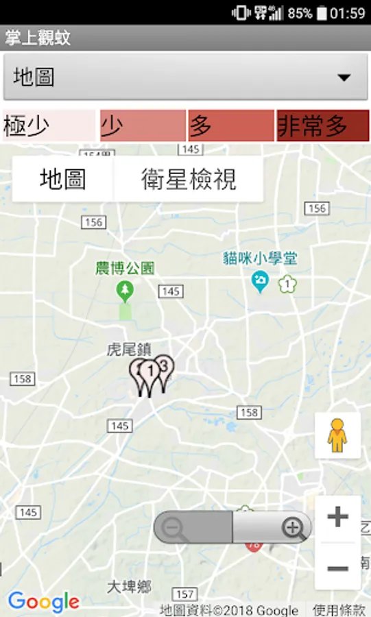 藉由地圖標示、數據一目了然,何處為蚊子出沒熱點,統計目前電到蚊子的數量,讓大眾清楚居住點是否為蚊子出沒熱區,提高警覺加以防疫。