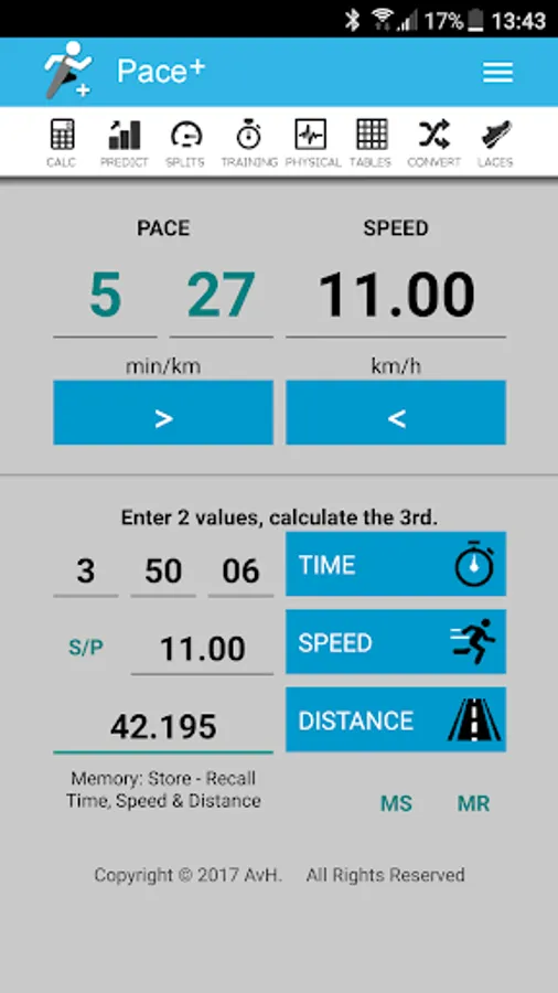 - Calculator for time, speed / pace and distance;