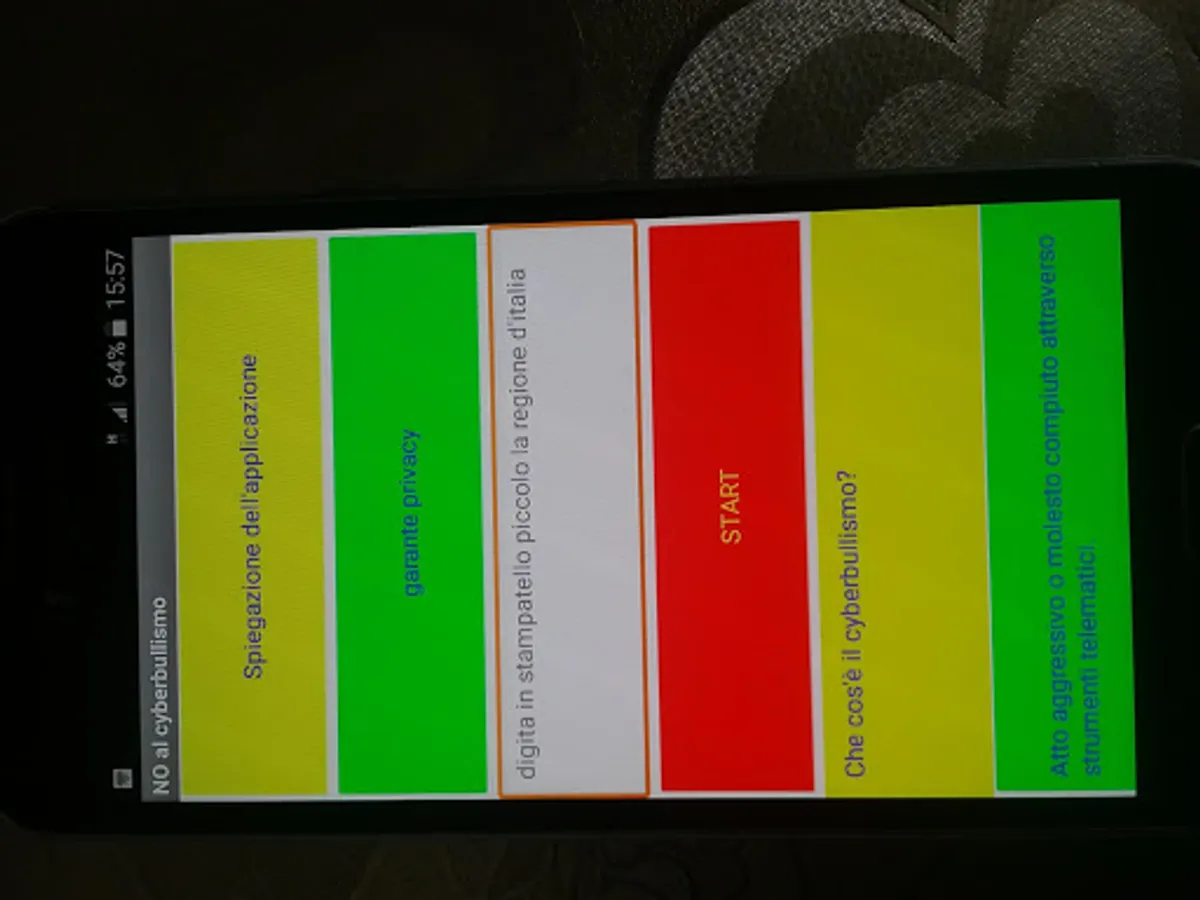 above the START key the user will type the region to which he belongs (for example lazio) in small block letters. Then there will be 10 questions with 3 possible answers each.