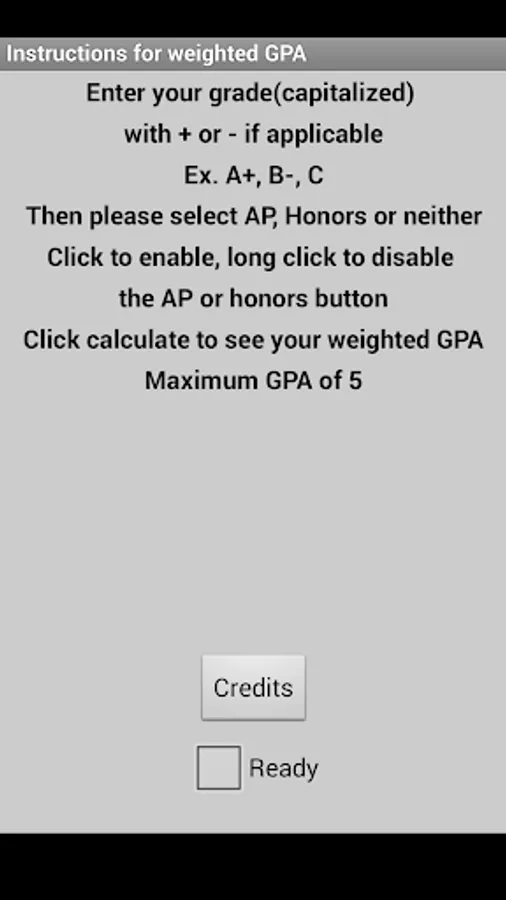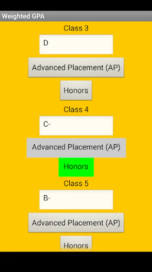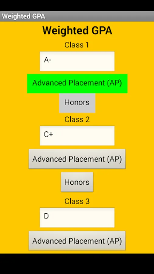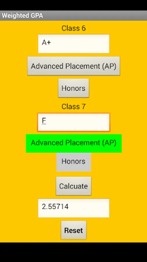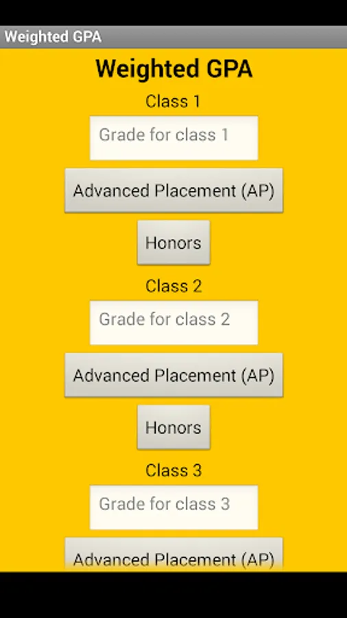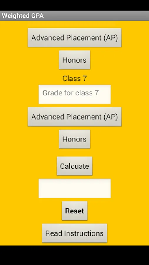 This app calculates your GPA based off of your grade in AP or honors classes. You are allowed to enter up to seven classes.The calculator uses a universal 5.0 GPA. Simpy enter your grade and select AP, honors, or neither for your classes then click calculate.