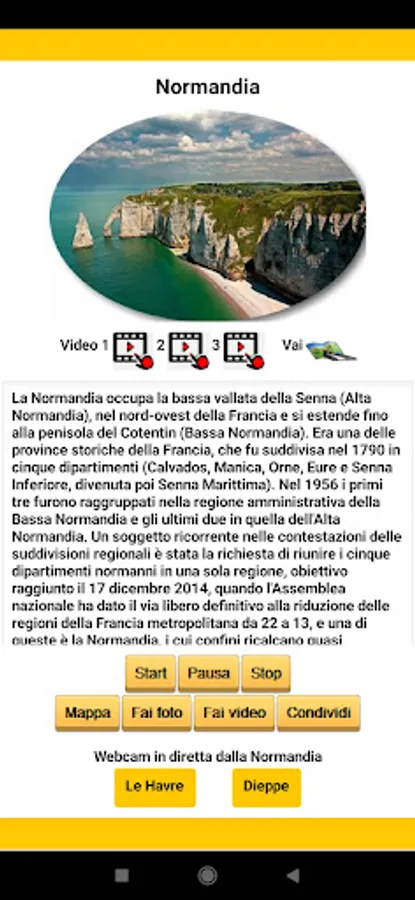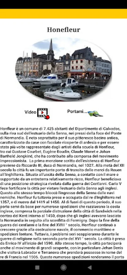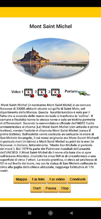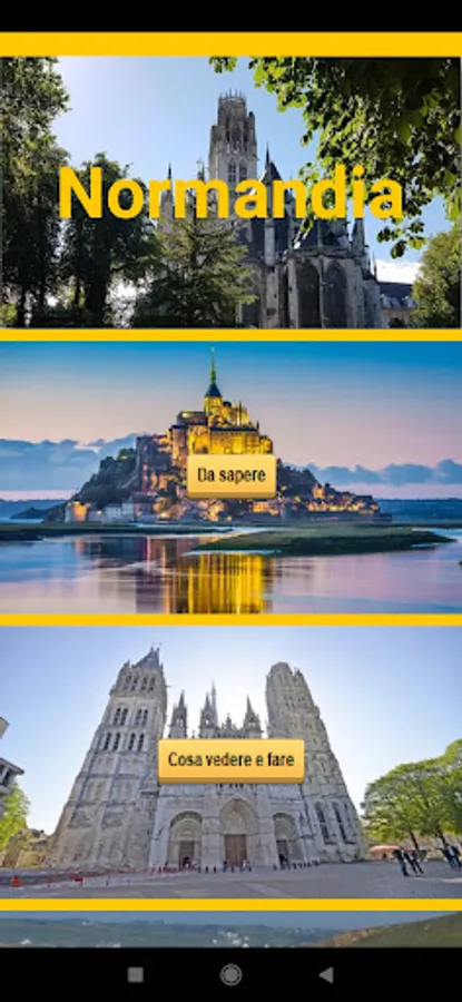 Guide to the most beautiful things in Normandy, the cities: Caen, Cherbourg, Dieppe, Honfleur, Le Havre, Rouen. The castles: Castle of Caen, Castle of Crèvecœur, Château Gaillard, Castle of Gaillon, Château d'Ô, Château d'Harcourt, Château de Beaumesnil, Château de Falaise, Château du Champ de Bataille, Château de Vendeuvre, Château de Bricquebec, Chateau de Beaurepaire (Martinvast), Castle of Domfront, Castle of Carrouges, Castle of Lassay, Castle of Vascœuil, Castle of Bizy, Castle of Etelan, Castle of Gisors, Castle of Fleury-la-Forêt, Castle of Martainville, Chateau du Taillis , Fontaine-Henryì Castle, Saint-Sauveur-le-Vicomte Castle and Isle-Marie Castle. Normandy cradle of Impressionism. Mont Saint Michel, The tides, History, How to get there, How to get around, Abbey of Mont Saint-Michel (L'Abbaye du Mont-Saint-Michel), Notre-Dame Sous Terre Chapel, The court of the Advance and the court of the Boulevard, Maison de l'Arcade (The house of the gallery), The houses in the street main, La Tour Boucle, La "Merveille" of the Abbey, The crypt of San Martino , The old cemetery of the abbey, Where to eat and where to stay. Normandy landing beaches, Sword Beach, Juno beach, Gold Beach, Omaha beach, Utah Beach, The Pegasus bridge just before Caen, The Caen Memorial, " Normandy American Cemetery and Memorial ", The German cemetery in" La Cambe ", Pointe du Hoc, The statue of the paratrooper in Sainte-Mère-Eglise Others, The 360-degree circular cinema of Arromanches, The Memorial Museum of the Battle of Normandy, The Overlord Museum near Omaha Beach, The Juno Beach Center in Courseulles-sur-Mer, The AirBorne Museum in Sainte-Mère-Eglise, The D-Day Experience just before arriving in Sainte-Mère-Eglise and The Landing Museum . What to buy in Normandy, what to eat in Normandy, go out at night in Normandy, move around Normandy, events and parties and YouTube videos. It has a voice guide that will explain in detail the structures or monuments you want to visit and will accompany you by the hand to find monuments, hotels, restaurants and much more. This will be enriched more and more and will make your stay in Normandy a pleasant and carefree thing.