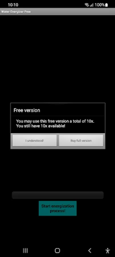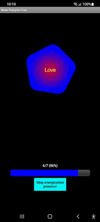 Depending on the current energy of the environment, the energization can take up to just over about 2 minutes. Wait until the process is ready to receive a fully energized beveradge. You can follow the current energization progress on the displayed process bar. In the end the water is put into a positive vibration by the smartphone and you get the message that the energization has been completed. Now you can remove the glass.