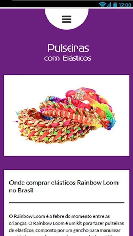 In the application content also contains information on: fashion Elastic Bracelets; WHAT TO WATCH TO BUY THIS PRODUCT; Fashion bracelet may contain carcinogen; Bracelet can have toxic substance; Cross Enfilado for bracelets; How to Create an Elastic Bracelet; Where to buy elastic Rainbow Loom in Portugal and Brazil.