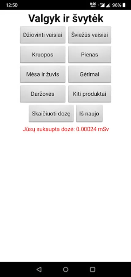 The app is for everyone interested in Physics and the world around us. As the message around us constantly, there is a radiation background reaching us both from the depths of the Earth and from the expanses of space. The food we eat is no exception. Due to natural processes, a small amount of radioactive material enters plants and animals, which become our food. This app will allow you to estimate what radiation dose we get from food during one meal.