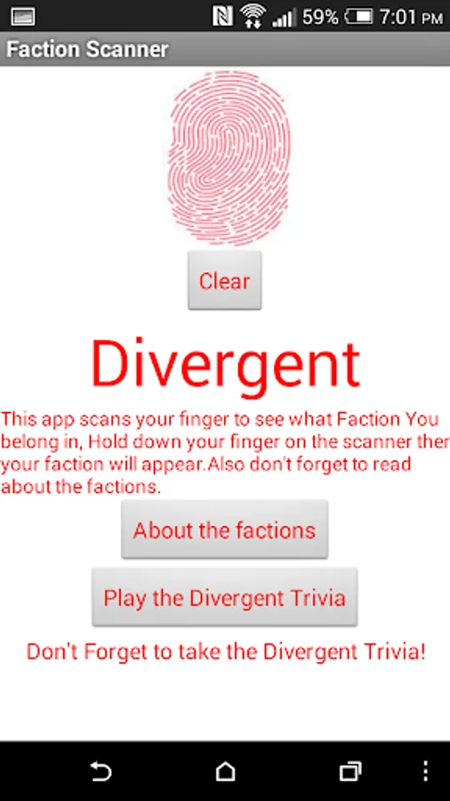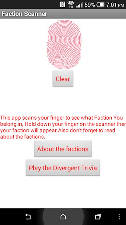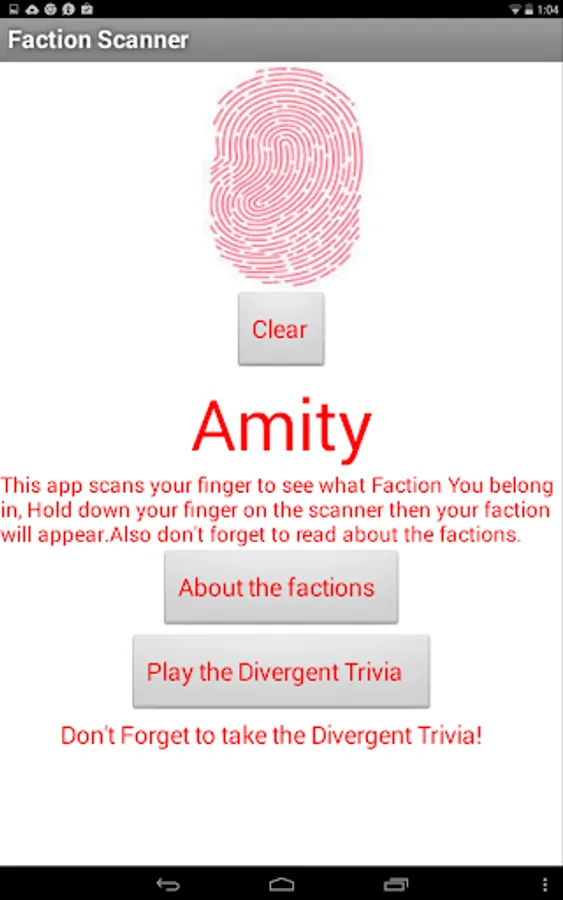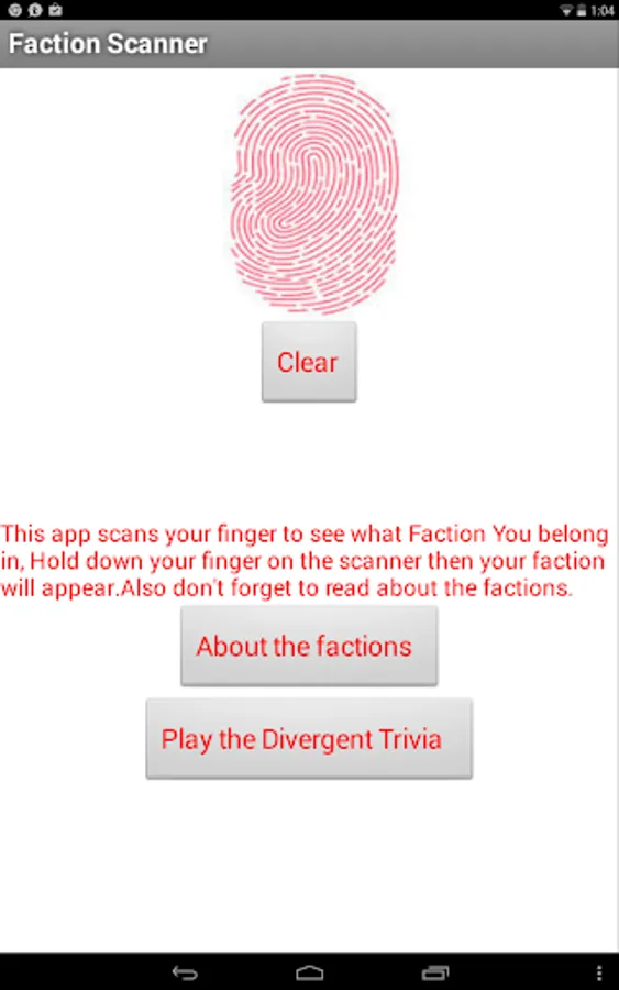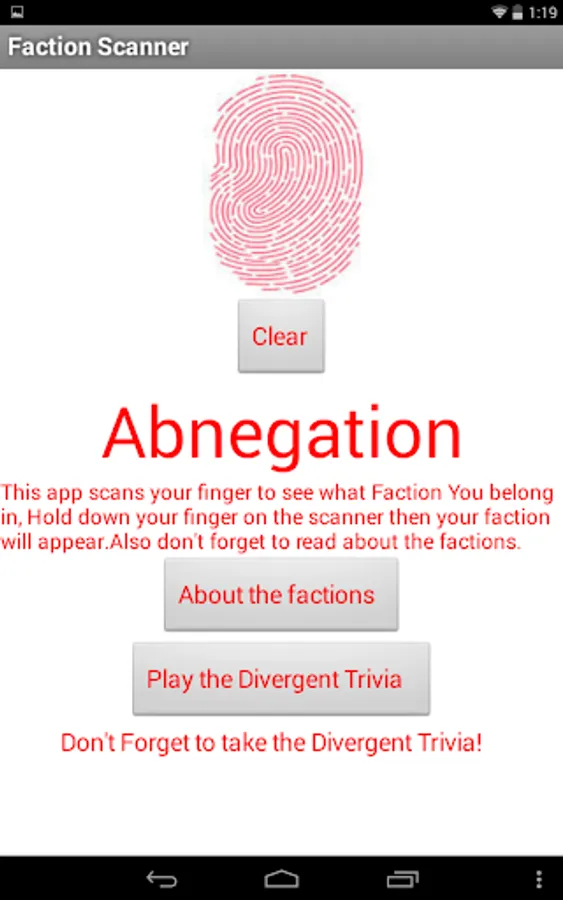 Scan your finger to find out your faction. Also, read about the factions and answer trivia questions!