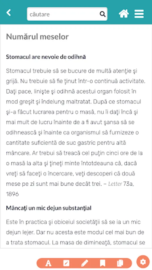 The application offers options for text interaction, dynamic content search, text size change, adding personal notes, highlighting paragraphs and bookmarks.