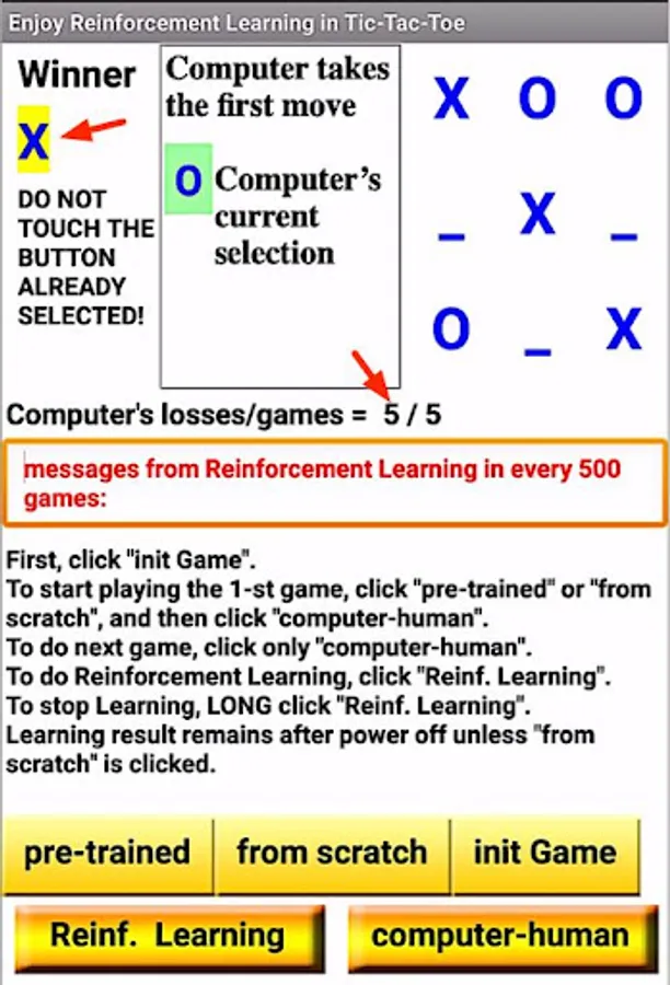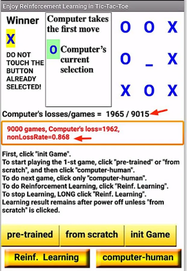 As an example, we use Tic-Tac-Toe, a well-known and easy game. The main feature of this app is that you can adjust the strength of your opponent computer player according to the degree of reinforcement learning and enjoy the match.