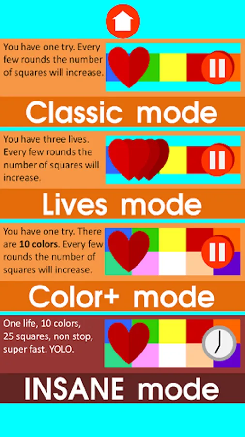 In this game you will need to remember the colors and then select the color that disappered! There are different modes for a diverse experience (more modes are coming soon)!