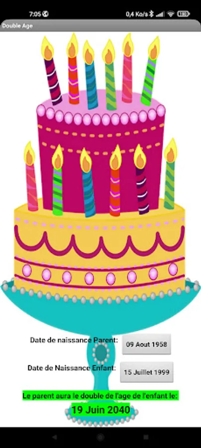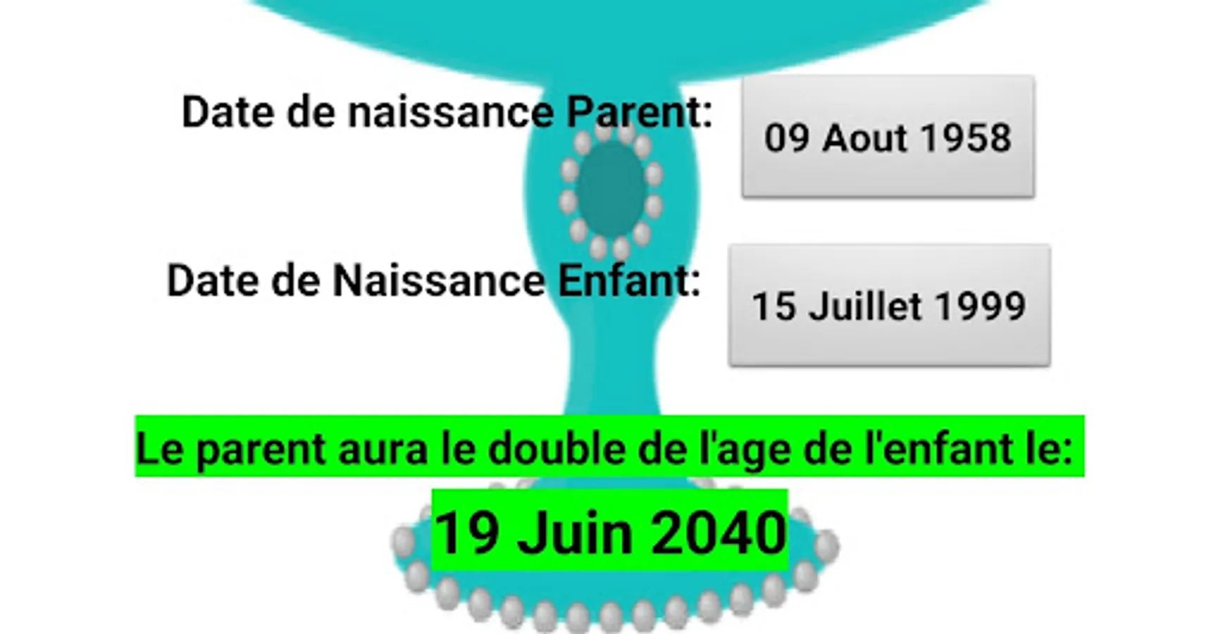 This application allows to calculate what day a parent will have exactly the double age of his child according to the date of birth of the parent and the child