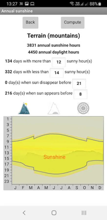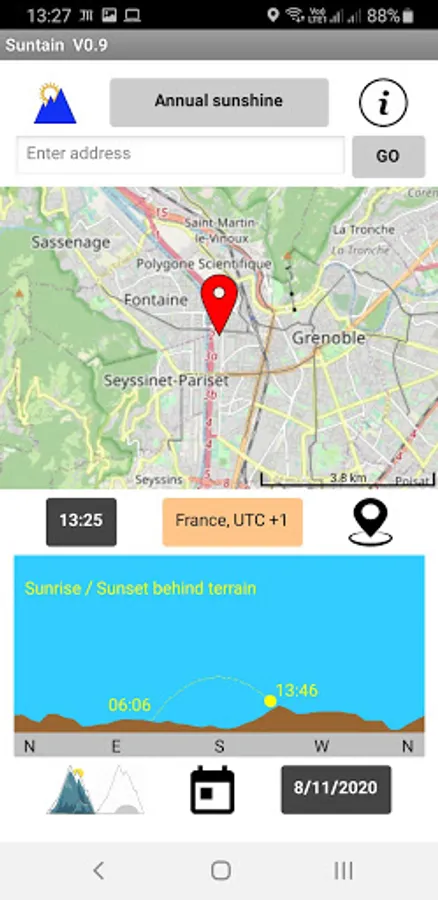 This application visualize position and trajectory of the sun, based on location, date and most importantly terrain (mountains). It provides: