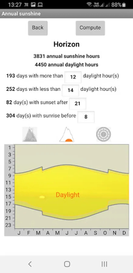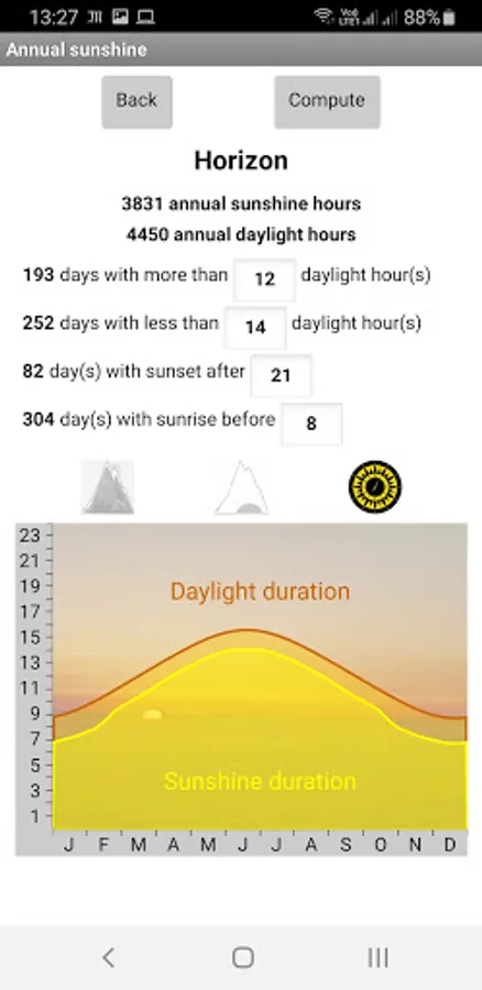 Annual information is also available: sunrise and sunset along the year, daylight and sunshine duration for every day. On top of this, number of days with more (or less) than a specific amount of sunshine duration is available, plus much more information.