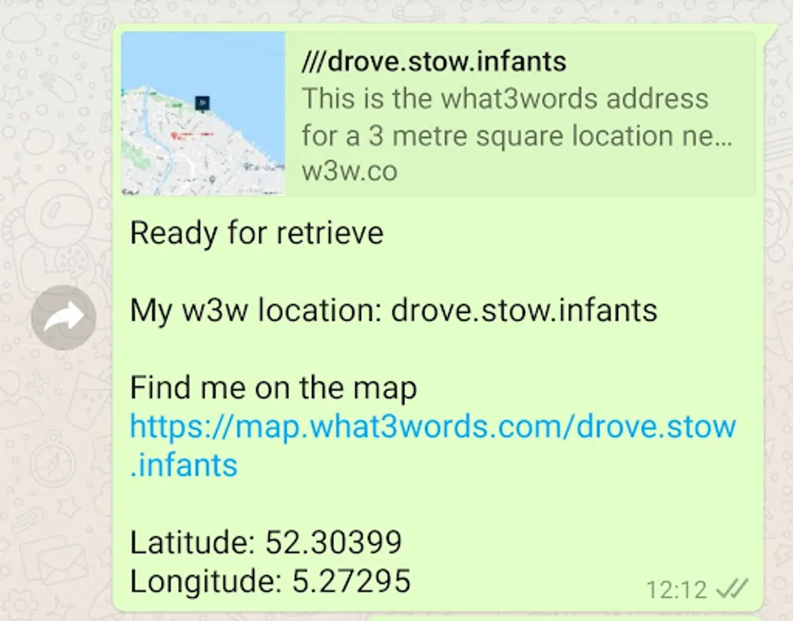 If you want to also send the location information, the process is the same as under 6. but the location information is added in w3w as well as latitude/longitude format.