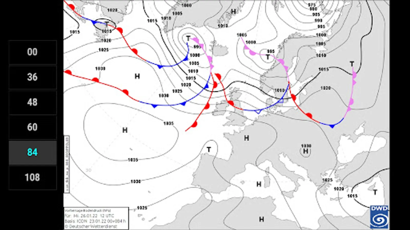 • DWD analysis for +00 and forecasts for 36, 48, 60, 84 and 108 hours