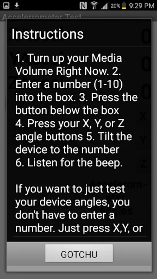 Test your devices accelerometer using this app that lets you set a certain angle, and then Beeps repeatedly when your device hits that specified angle.