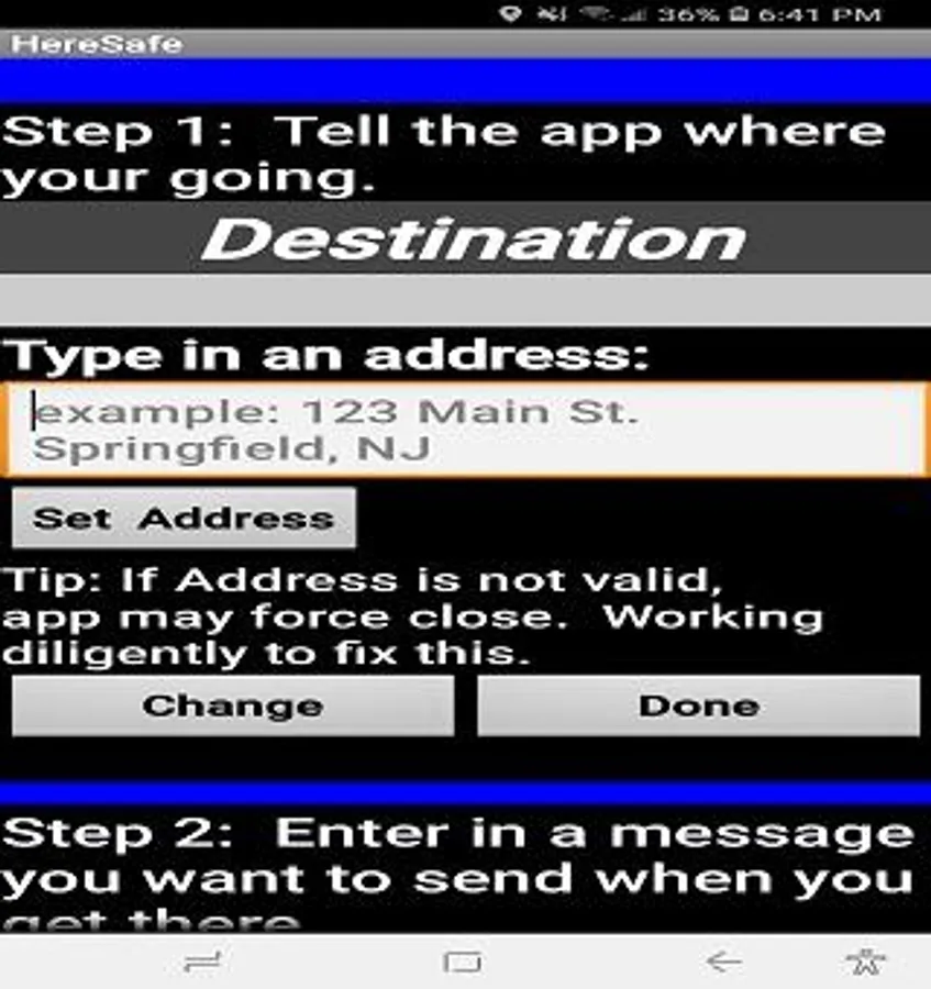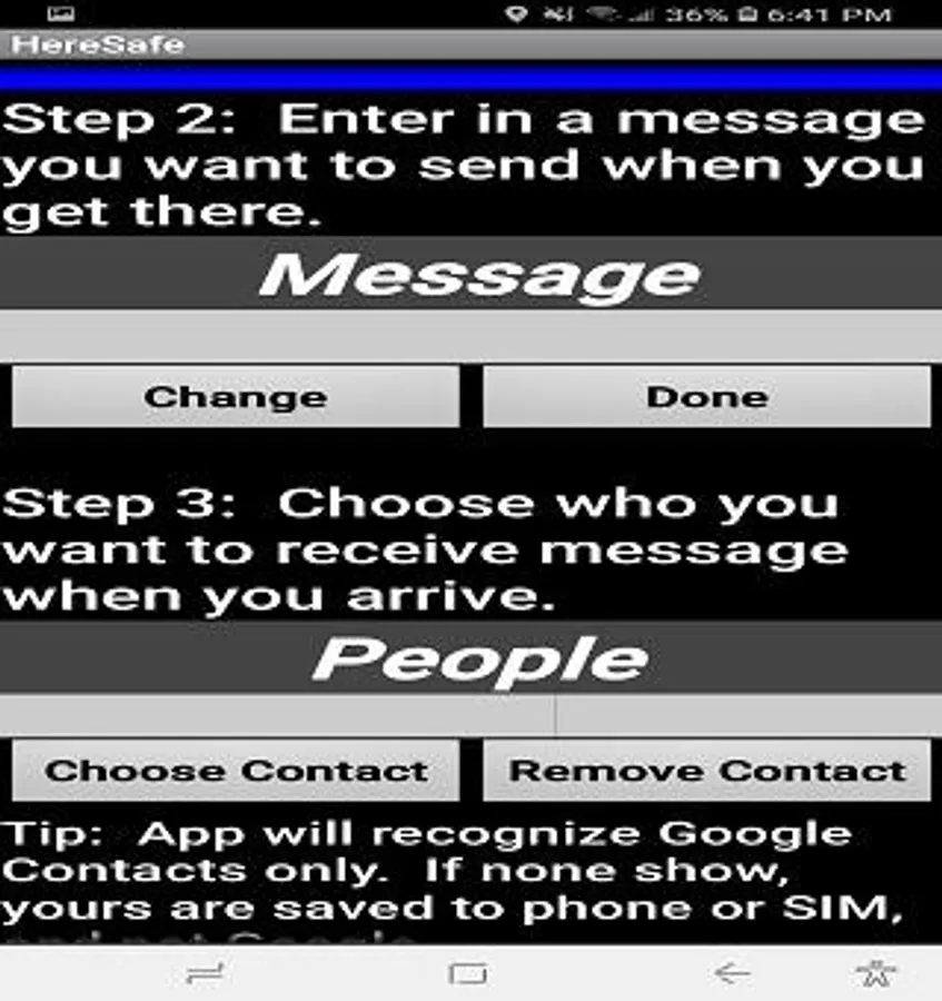 Enter your destination address, the text message you want to send, and choose which contacts you want to send the text message to. This app will automatically send the text message when you arrive at your entered destination.