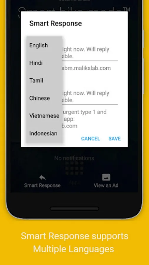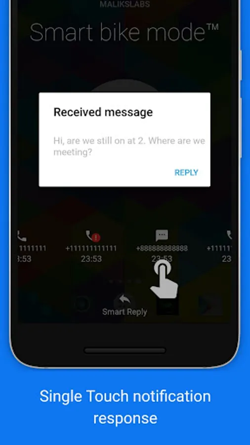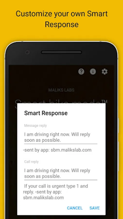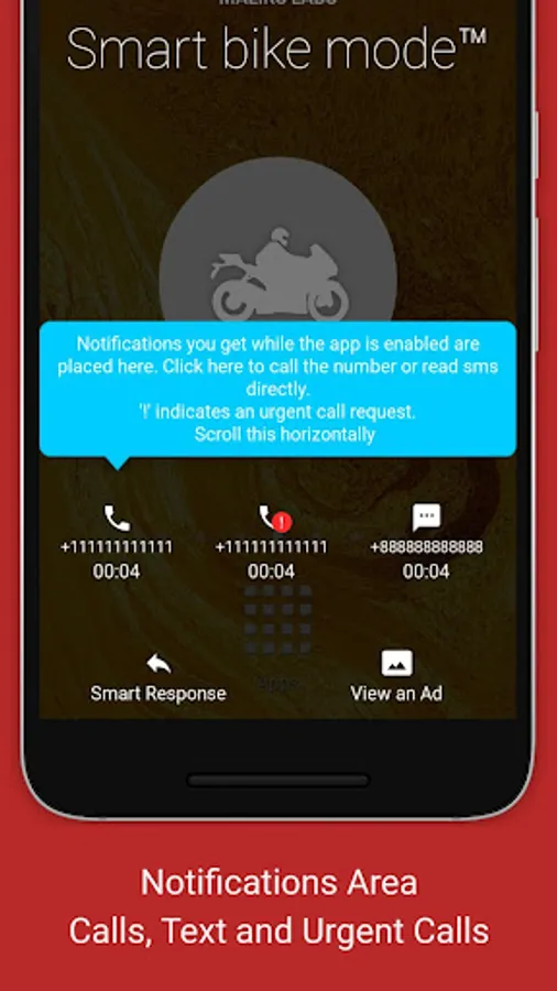 Smart bike mode Auto Responderâ„¢ is a Android mobile app which allows you to ensure minimum distraction while riding a two-wheeler. This feature once enabled automatically replies to calls with pre-recorded text messages and doesn't notify the rider until it is an URGENT CALL request from the caller.