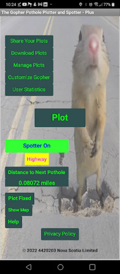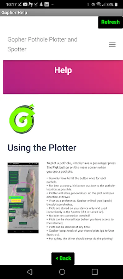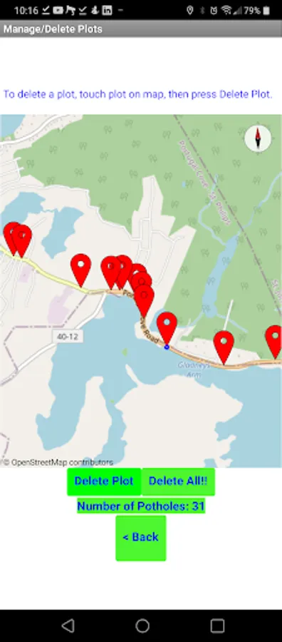The Gopher Plotter feature allows user to make and store their own personal pothole markers on their device with easy push of a large on-screen button. There is no limit to the number of plots that can be stored and plots can be deleted/managed as necessary (plots can be displayed on maps and plots corresponding to fixed potholes can be deleted in the Manage Plots screen).