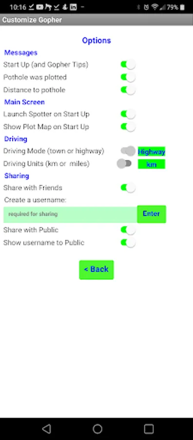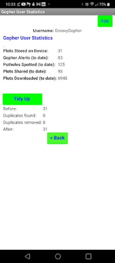 Gopher also allows the user to set other preferences (such as turning on the Spotter automatically when the App is started) in the "Customize" screen. Gopher also comes with a "User Statistics" screen which keeps track of the number of pothole plots and alerts. It also has a "TidyUp" feature which removes unintended duplicate plots.