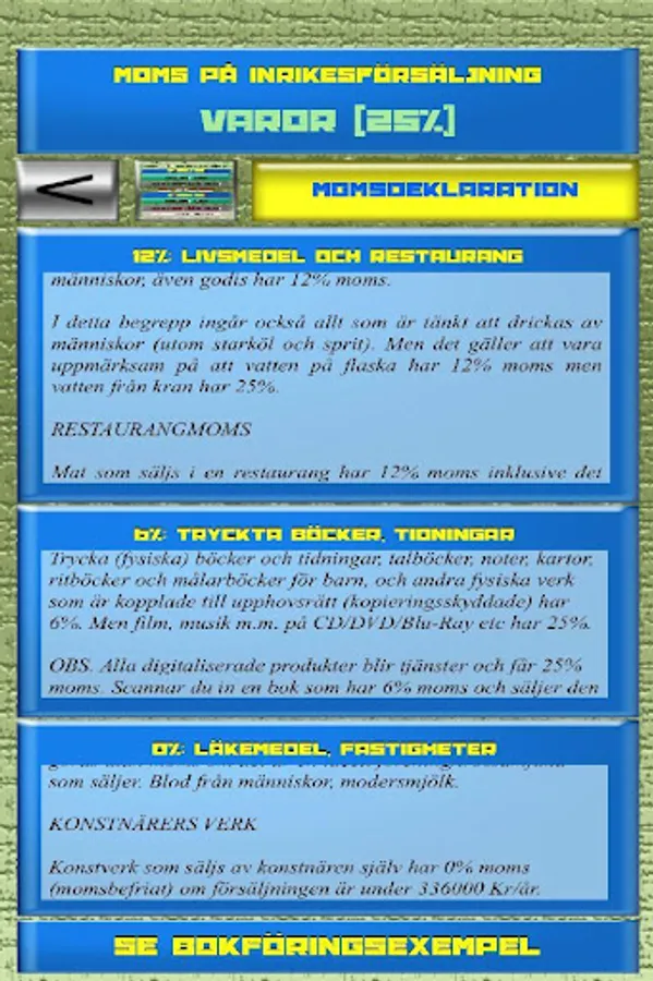 The app includes detailed information on VAT rates 0%, 6%, 12%, 25% and what is below the respective rate of VAT in Sweden. More info about the app here: