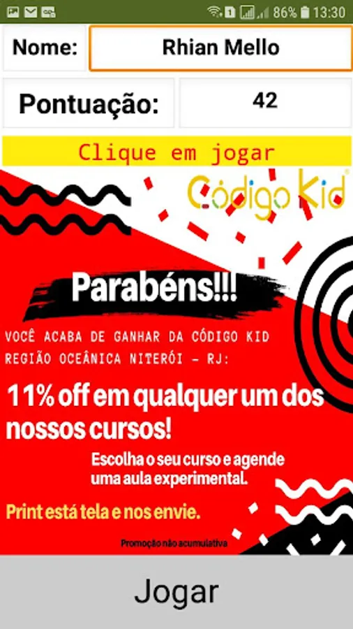 This application was created with the intention of playing, but at the end of the game who hit the 40 points can benefit from 11% discount on any of our courses Kid Code Ocean Region of Niterói - RJ.