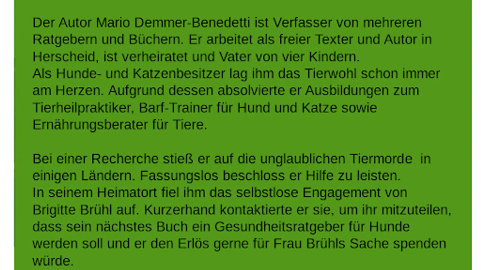Mario Demmer-Benedetti is the author of several guidebooks and books. He works as a freelance copywriter and author in Herscheid and is the father of four children. As a dog and cat owner, animal welfare has always been important to him. So he completed an apprenticeship as a veterinary practitioner. While researching, he came across the unbelievable dog murders in some countries. He decided to help and wrote this guide. 100% of the proceeds from this book go to animal welfare. The book breaks new ground, it is a guide for dealing with dog diseases, at the same time it tells the exciting story of lupus and it generates donations for animal welfare.