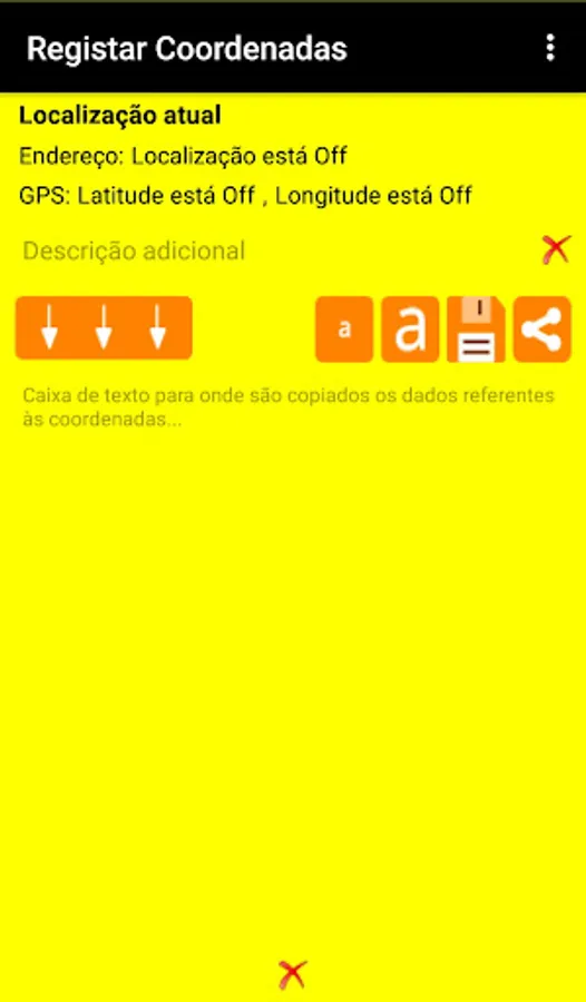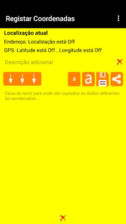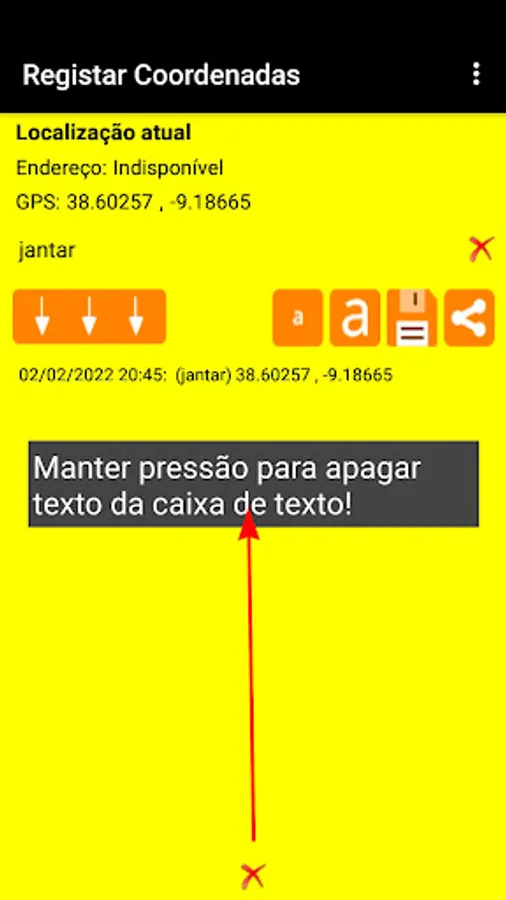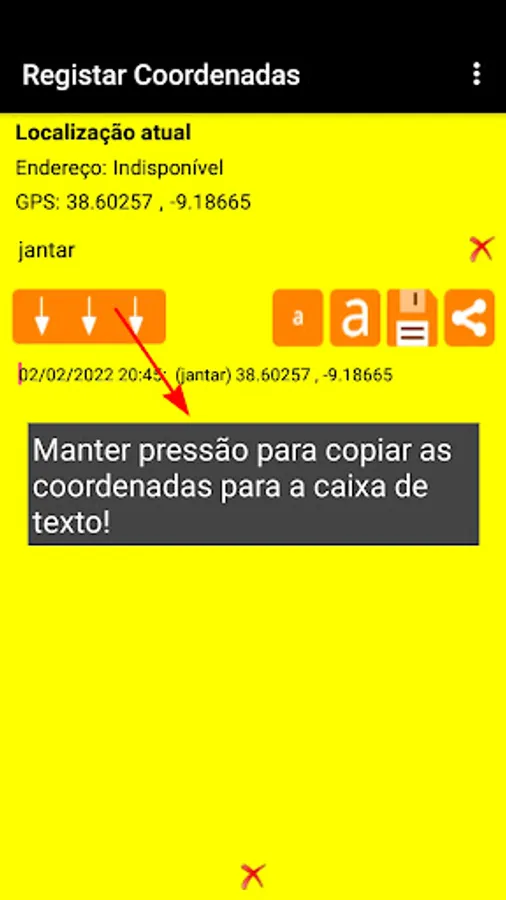 When «Copy Coordinates» (button with down arrows) the current coordinates, address and description are copied to the text box and this information is stored in the internal memory.