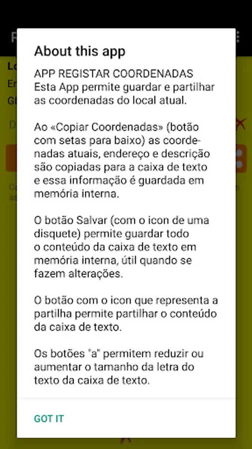 This application simply shows the current coordinates (of your current location) and allows you to save those coordinates in a text box and in internal memory.