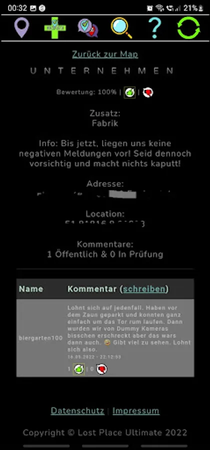In the Lost Place Ultimate App, you can easily search for a Lost Place using the map or the search function. Lost Places can be commented on and the comments can be voted on.