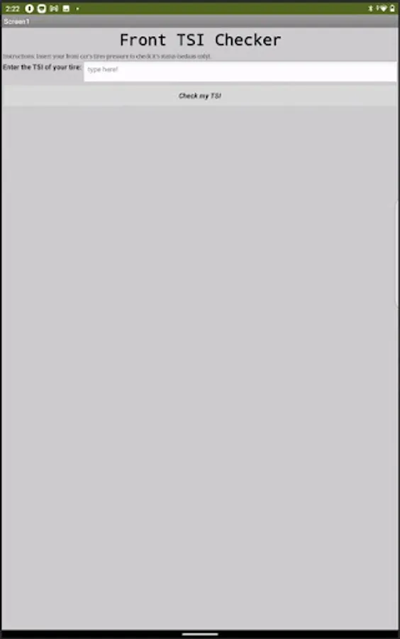 A solution to help you know what the status of your car's tires are! Insert your tire PSI into the bar, and let the app inform you of the status of your car tires: whether air needs to be filled, air needing to be taken out, or if your air is at the perfect level.